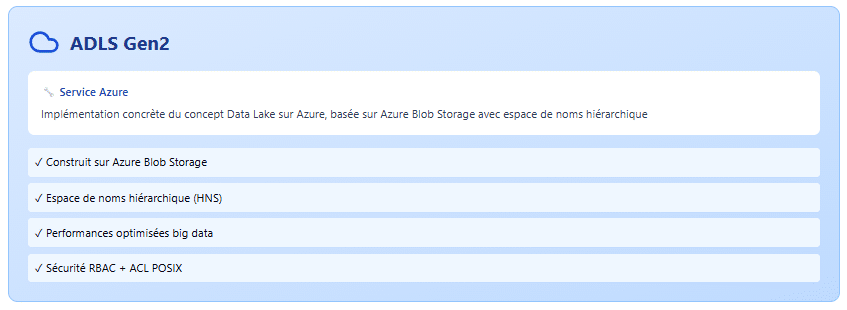 Azure Data Lake Storage Gen2 (ADLS Gen2) est le service Azure qui met en œuvre concrètement le concept de Data Lake.