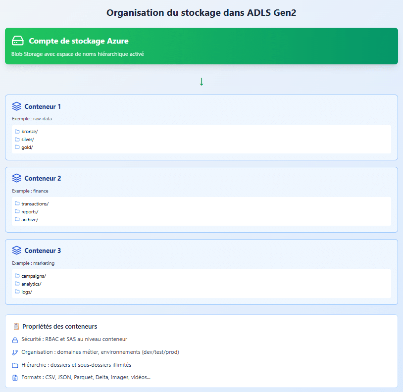 Dans ADLS Gen2, les données sont regroupées dans des conteneurs. Pense-les comme de grands dossiers dans ton compte de stockage Azure : chaque conteneur rassemble des fichiers/objets BLOB (bruts, transformés ou prêts à l’analyse) et peut contenir des dossiers et sous-dossiers. Cette organisation permet de séparer par domaine métier, environnement (dev, test, prod) ou niveau de traitement (raw, curated, gold). Fidèle au schéma en lecture, les données restent dans leur format d’origine et ne sont structurées qu’au moment de l’analyse.