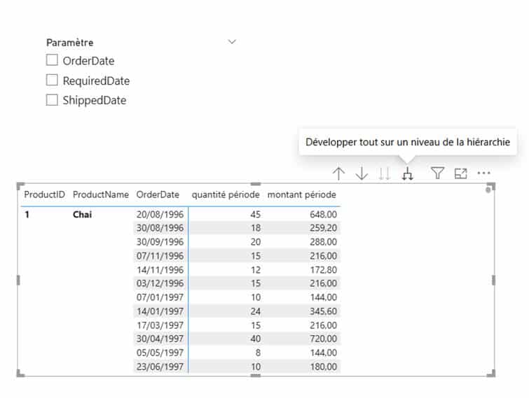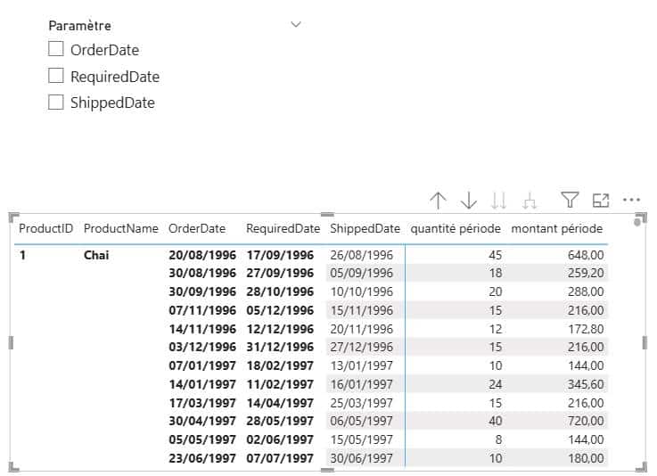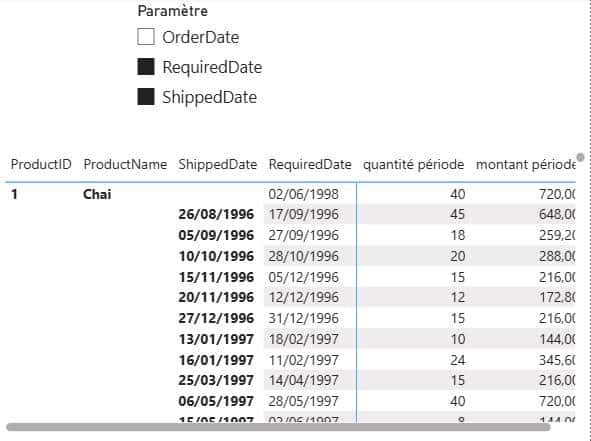En remplaçant les 3 colonnes « Orderdate » , « RequiredDate »et « ShippedDate » par le champ « Paramètre » de « Paramètre 2 », il obtient la matrice suivante :