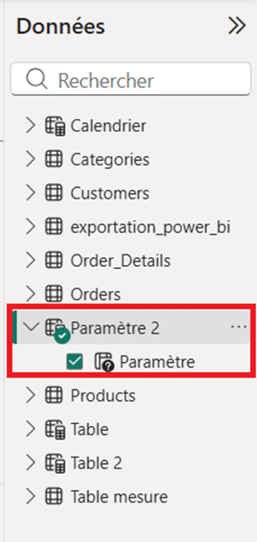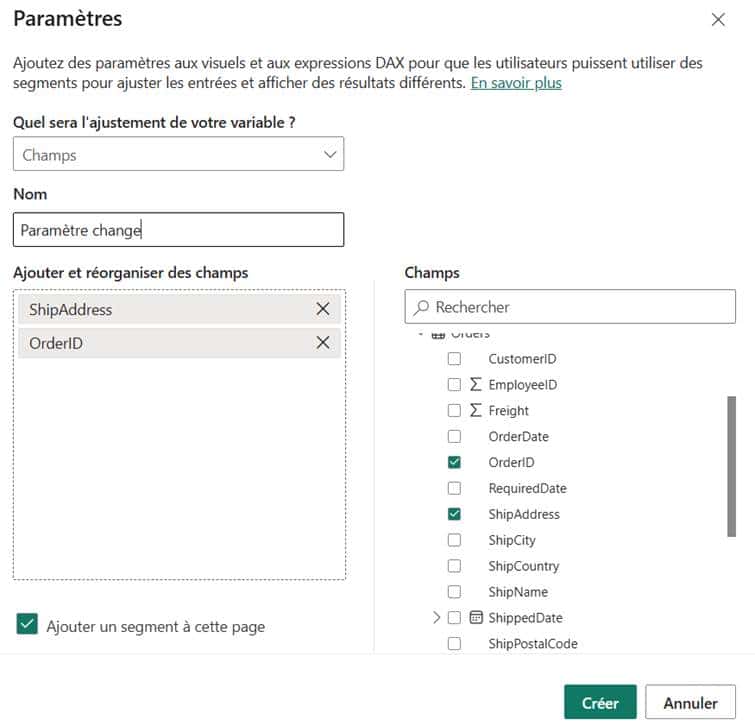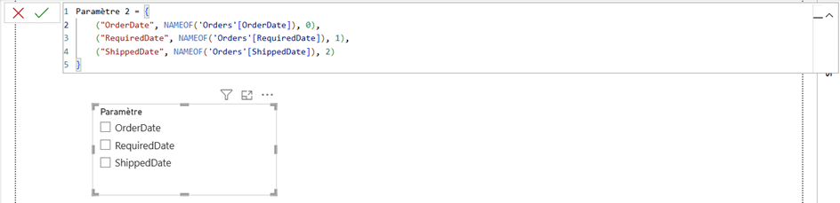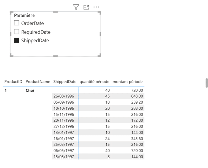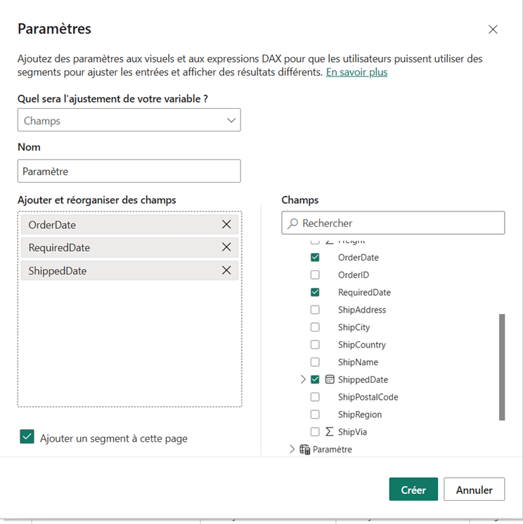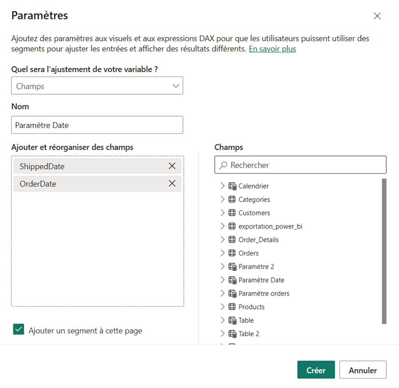 Puis l’utilisateur crée un deuxième paramètre « Paramètre Date » contenant les champs « ShippedDate » et « OrderDate » :