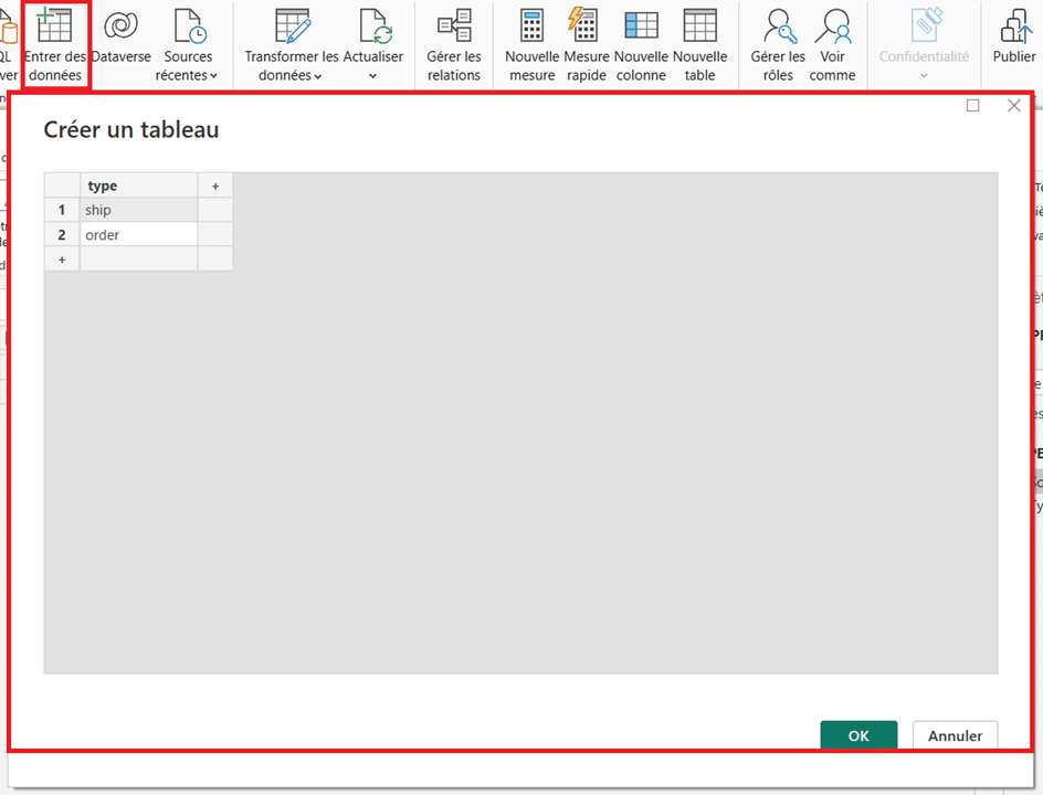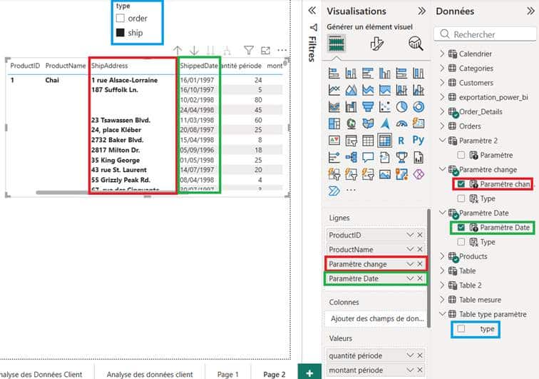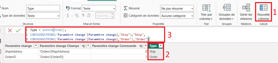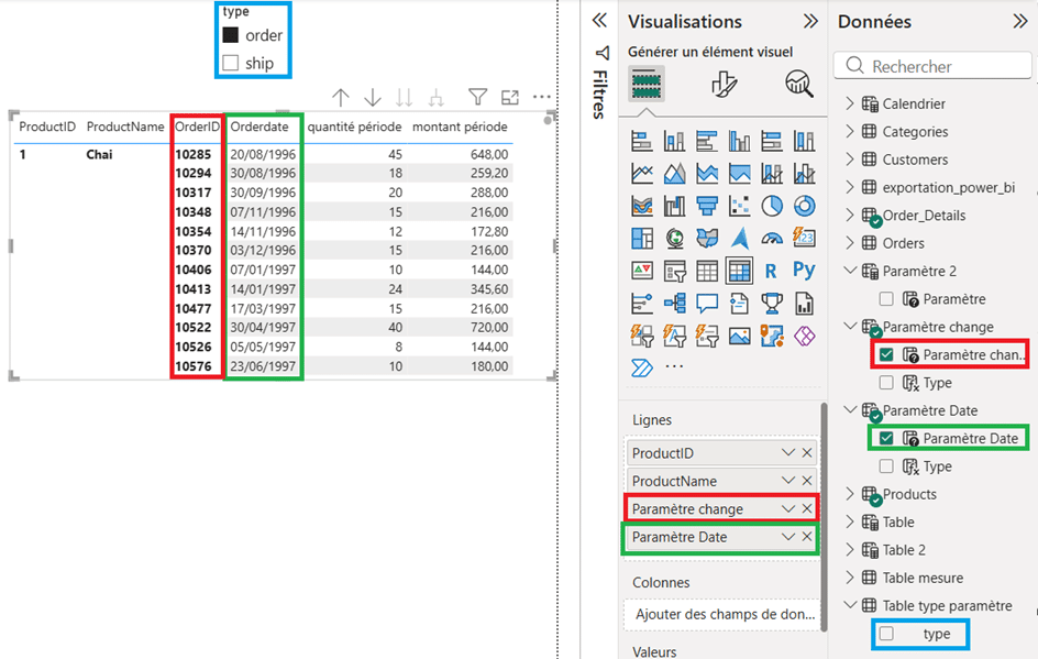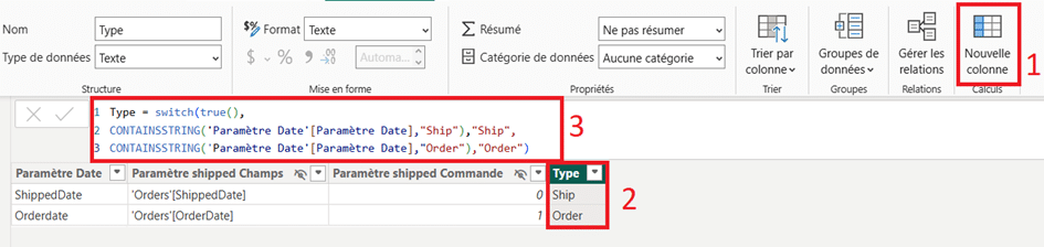 Ensuite, l’utilisateur crée une nouvelle colonne « type » dans la table « paramètre Date» qui va contenir « ship » et « order » suivant la ligne :