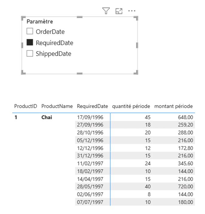 exemple en cliquant sur « RequiredDate » dans le segment :
