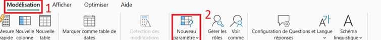 Pour cela, l’utilisateur crée un premier paramètre en cliquant sur le bouton « nouveau paramètre » (2) dans la section « Modélisation » (1) :