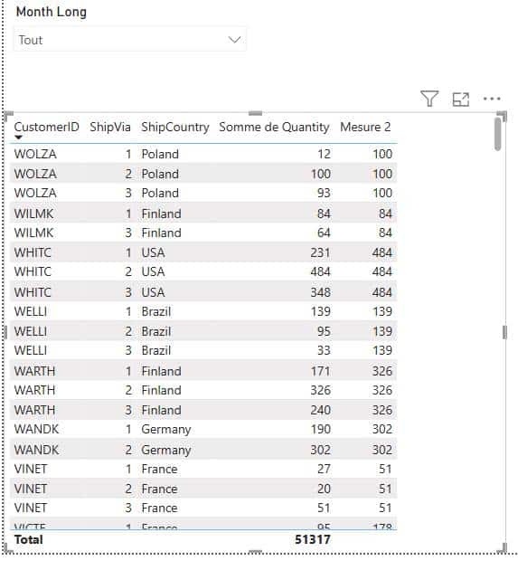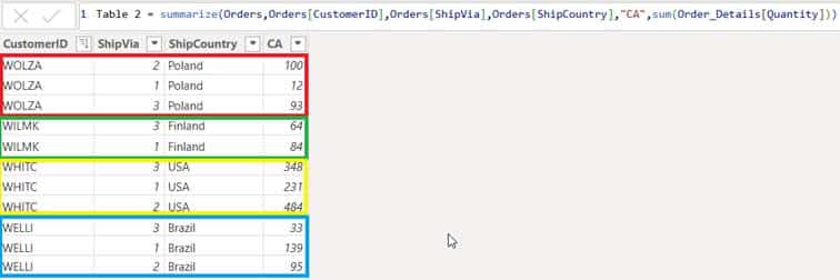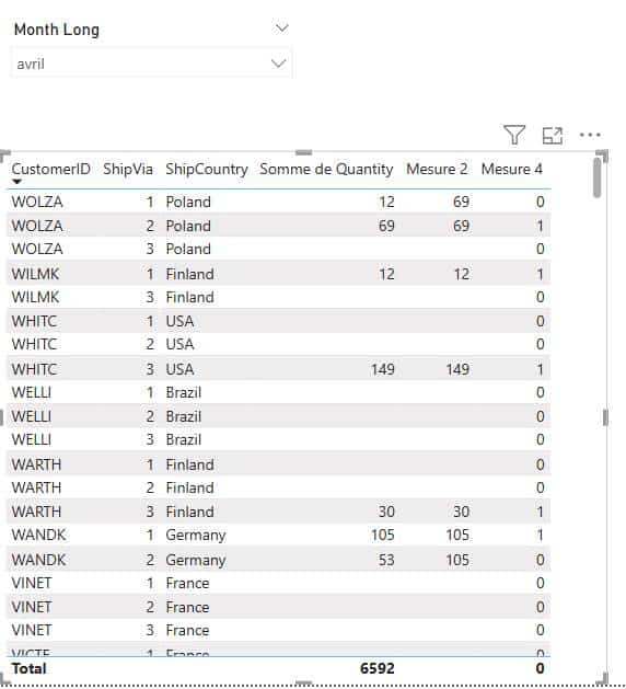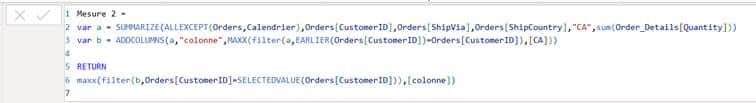 var a = SUMMARIZE(ALLEXCEPT(Orders,Calendrier),Orders[CustomerID],Orders[ShipVia],Orders[ShipCountry], »CA »,sum(Order_Details[Quantity]))