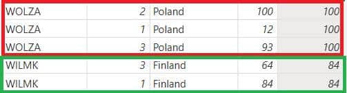 Le client WOLZA de la 2ème ligne est le même que celui de la 1ère ligne donc l’expression en DAX de la nouvelle colonne renverra le maximum de quantité envoyé (CA) entre les 2 lignes.