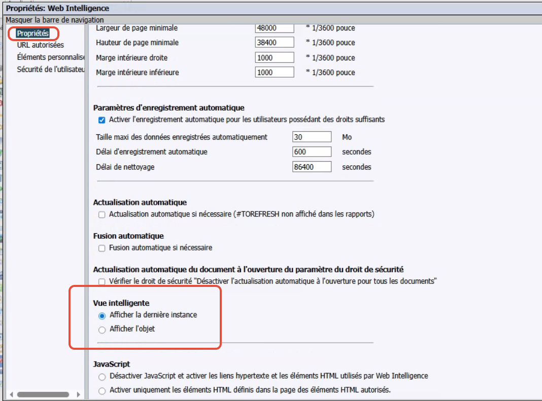 Sélectionnez Web Intelligence -> Propriétés.