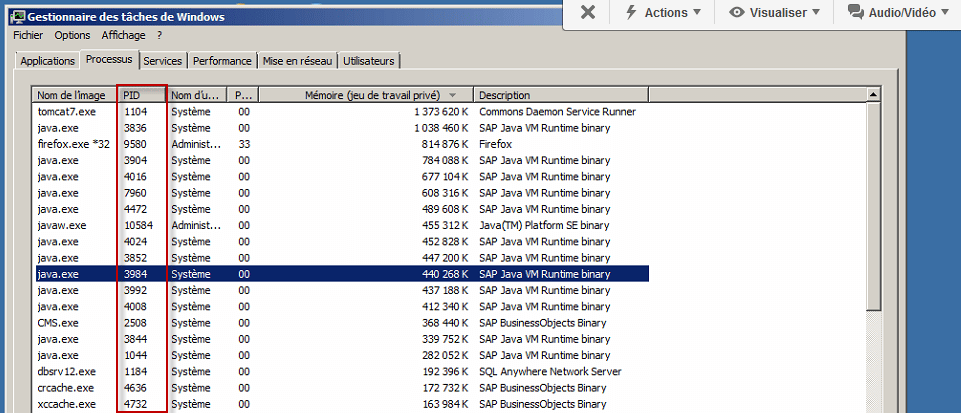 Vous pouvez alors connaitre à quel processus Windows correspond chaque serveur SAP BusinessObjects.