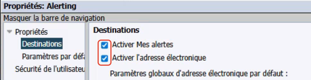 Sous Destinations, cochez les cases « Activer Mes alertes » et « Activer l’envoi par e-mail » (si des alertes par e-mail sont requises)