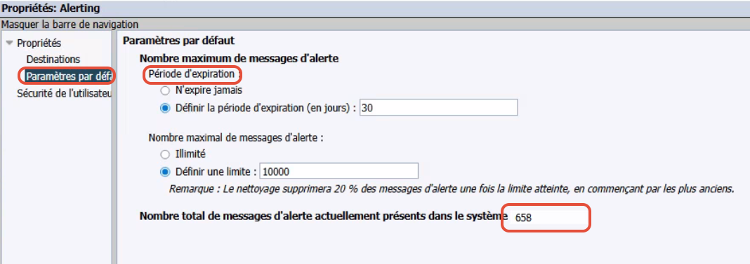 Vous pouvez définir la Période d’expiration des alertes et le Nombre maximal de messages d’alerte sous Options par défaut. Vous pouvez également afficher le nombre total de messages d’alerte actuellement dans le système sous cet onglet. Sauvegardez et fermez.