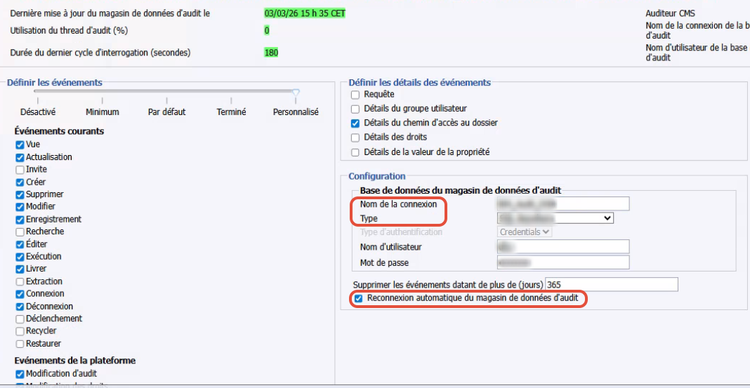 Sous la section Configuration >> effacez le nom d’utilisateur et le mot de passe, décochez la case d’option Reconnexion automatique du magasin de données d’audit.