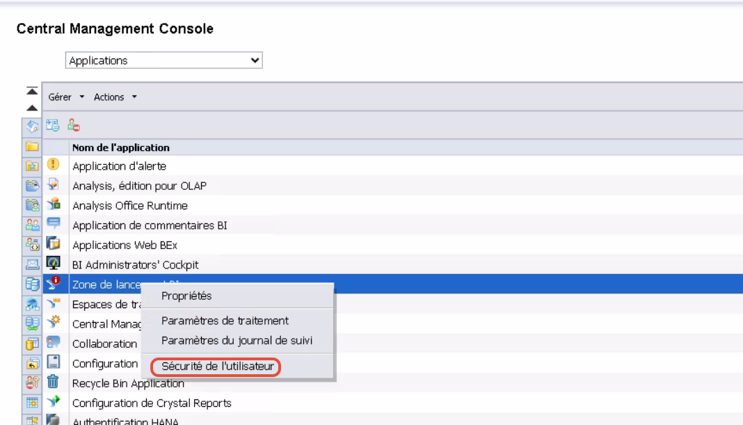 Cliquez sur Applications > Zone de lancement BI > onglet Sécurité de l’utilisateur.