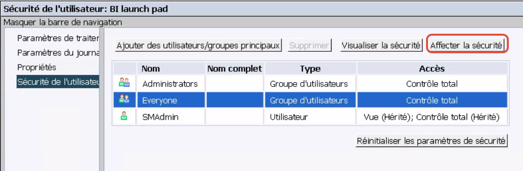 Cliquez sur Affecter la sécurité pour le groupe ou l’utilisateur approprié.