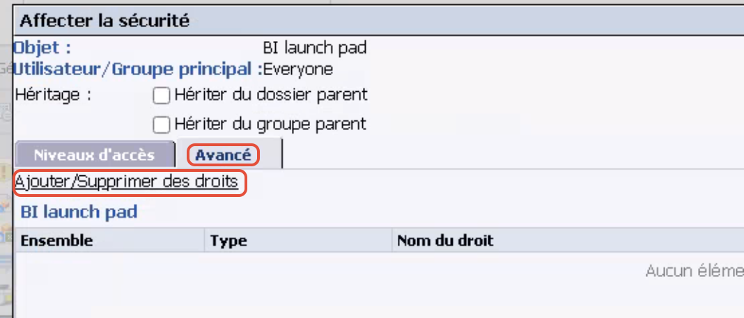 Cliquez sur l’onglet Avancé et sélectionnez Ajouter/Supprimer des droits.