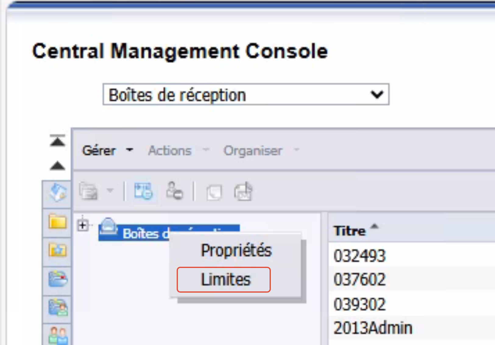 Cliquez avec le bouton droit de la souris sur Boîtes de réception et sélectionnez Limites.