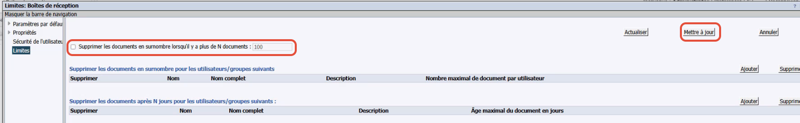 Dans la boîte de dialogue Limites, cochez la case Supprimer les documents en surnombre lorsqu’il y a plus de N documents et saisissez le nombre maximum de documents que la boîte de réception peut contenir et au-delà duquel des documents doivent être supprimés dans la boîte de réception. La valeur par défaut est 100.