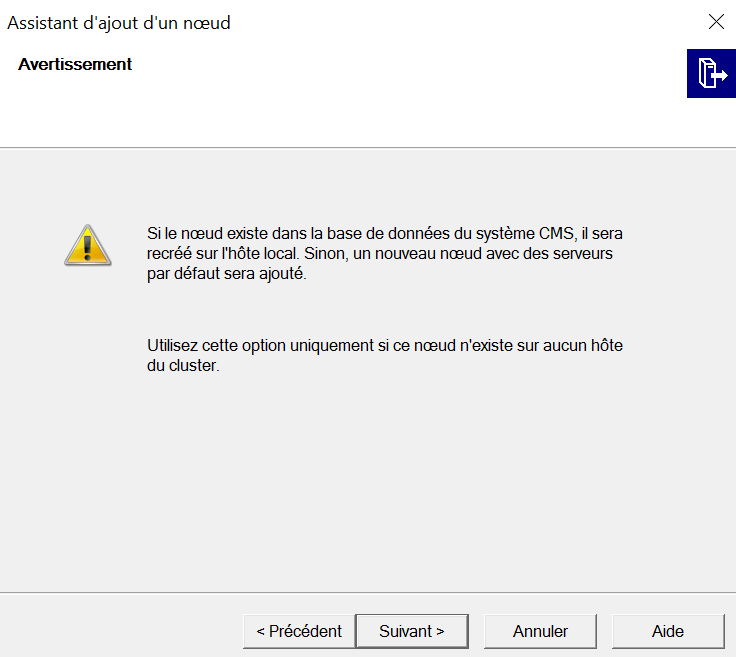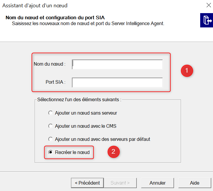 Entrez le même nom de nœud et le même port SIA (par défaut 6410) que le SIA existant – veuillez à bien sélectionner Recréer le nœud