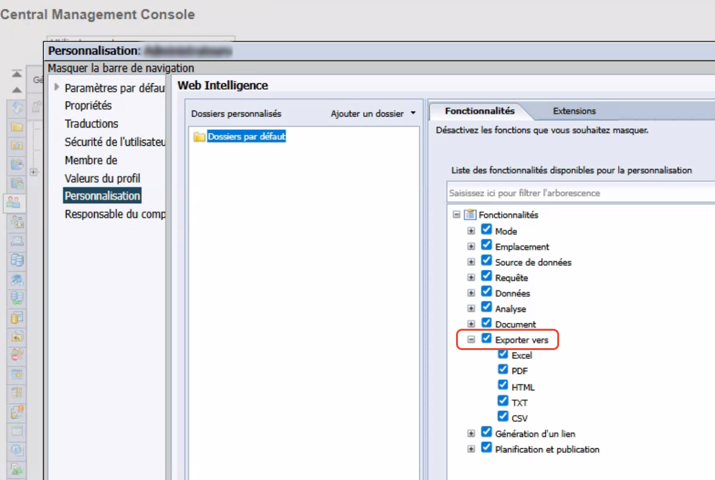 Supprimer l’option Exporter d’un document Web Intelligence