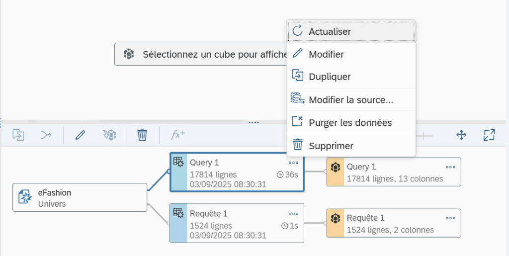 - Menu contextuel enrichi : Le menu contextuel d’une requête dans le panneau graphique contient désormais toutes les commandes essentielles.