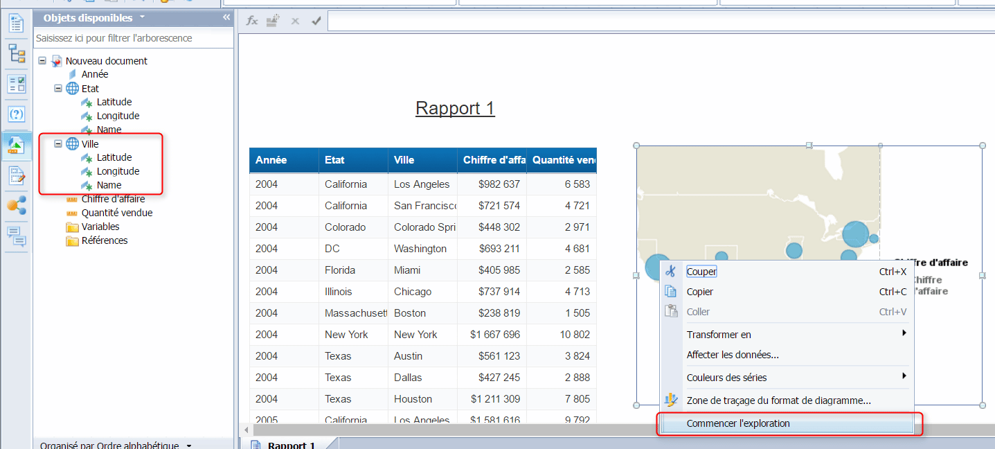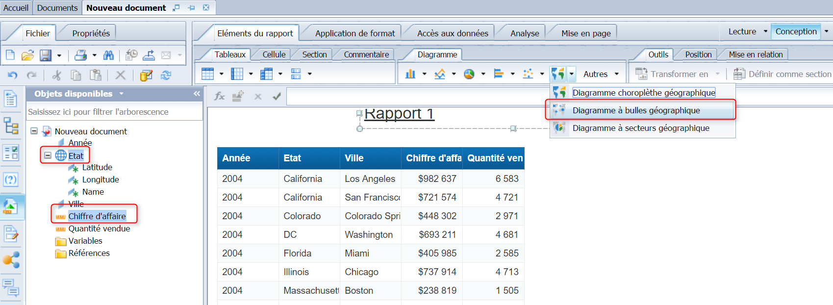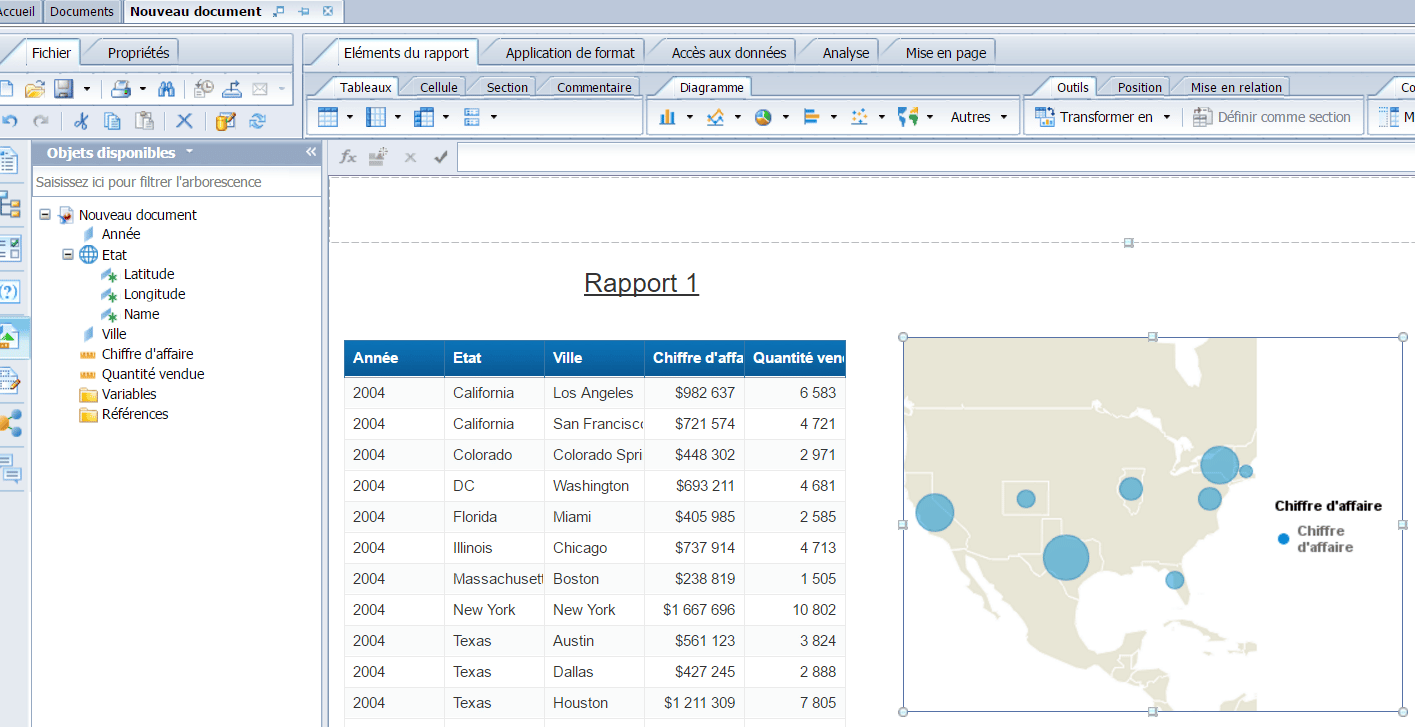 Avec ce tutoriel vous serez capable d’utiliser les cartes géographiques disponibles sur Web Intelligence dans vos documents. L’application Web Intelligence est capable d’identifier automatiquement la position des zones géographiques de plus de 100 000 habitants.