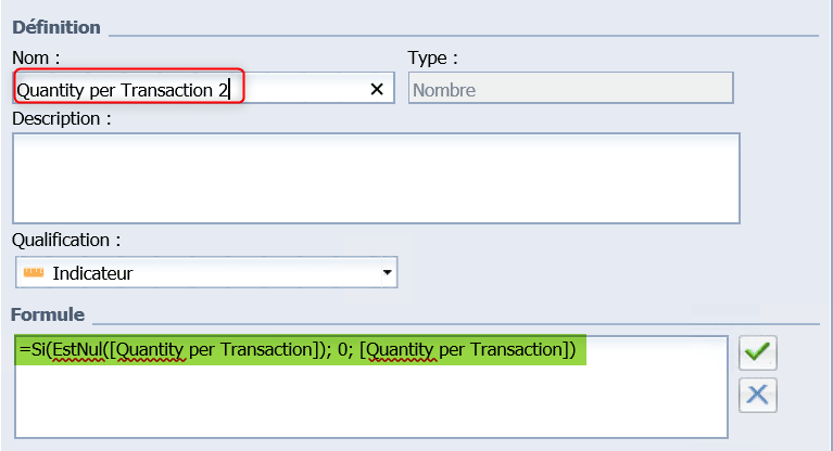 Vous pouvez maintenant créer une variable [Quantity per Transaction 2] de type indicateur afin d’afficher la valeur 0 à la place des valeurs de quantités vides obtenues pour les dates générées :