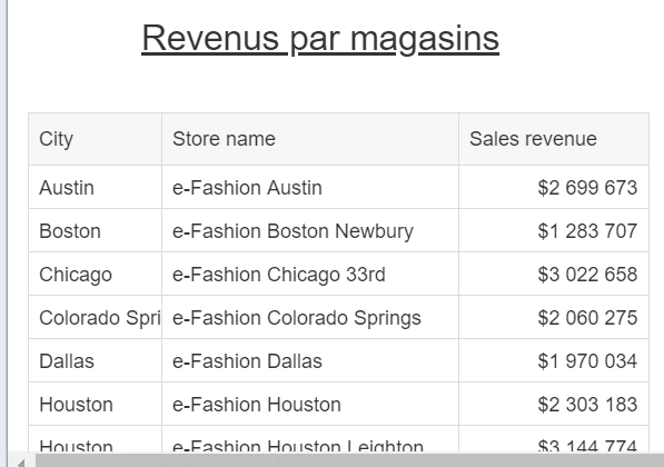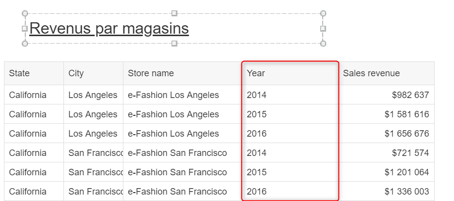 De la même manière que dans ce tutoriel, Le développeur d’un autre document Web Intelligence a généré un élément partagé à partir du tableau suivant :