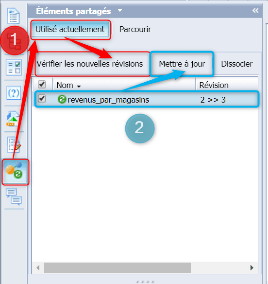 Revenez dans le document utilisant l’élément partagé, il n’est plus mis à jour automatiquement. Allez consulter la liste des éléments partagés actuellement utilisés (1) puis cochez votre élément partagé et cliquez sur « Mettre à jour » (2) :