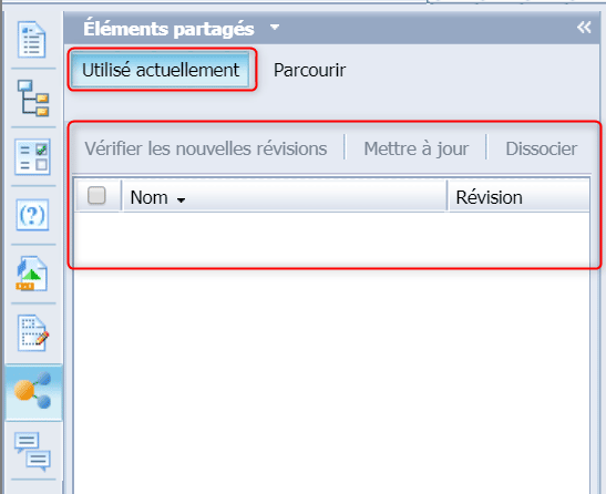 Votre élément partagé dissocié n’apparaîtra ainsi plus dans votre panneau des éléments partagés. Vous pourrez par contre en réimporter une version récente en allant dans « Parcourir » mais une nouvelle requête sera générée à partir de cet élément partagé :