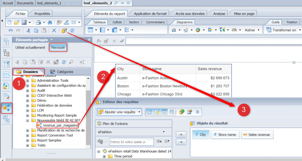 Après avoir ouvert un autre document Web Intelligence, vous pouvez accéder à la liste des éléments partagés présents sur votre plateforme SAP BusinessObject (1). Vous pouvez glisser – déposer l’élément dans un rapport (2), la requête ayant permis de générer le tableau de cet élément partagé sera automatiquement disponible (3) :