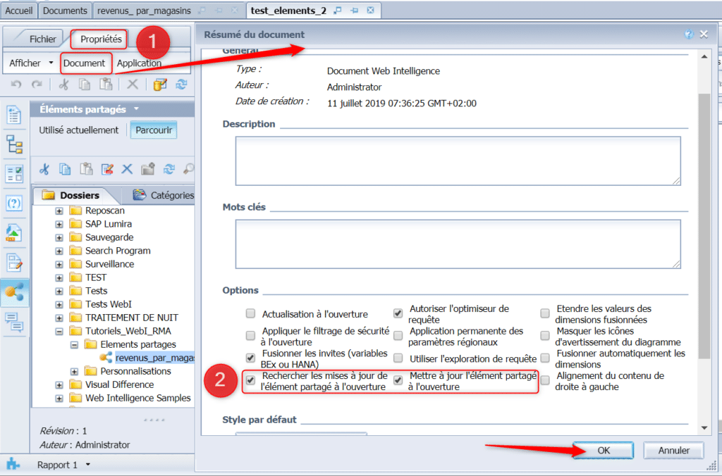 Nous allons voir le premier mode de mise à jour des éléments partagé, le mode automatique à l’ouverture. Allez dans « Propriétés » puis « Document » (1) et cochez « Mettre à jour l’élément partagé à l’ouverture » (2) et validez :