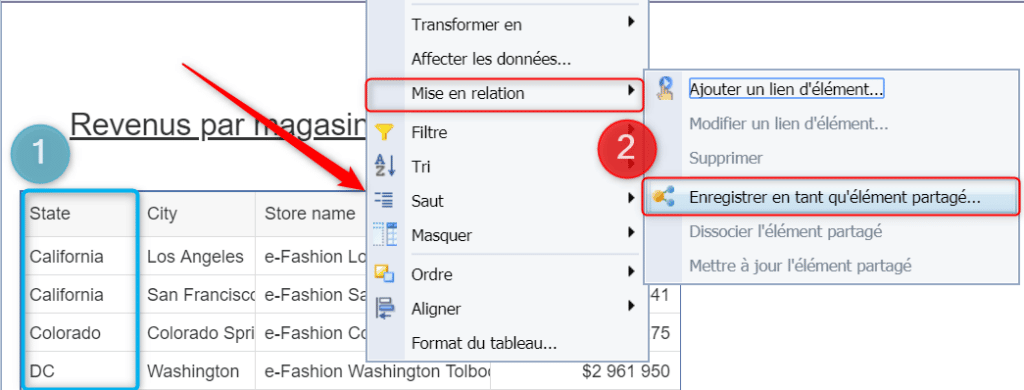 Revenez dans le document source de l’élément partagé pour lui ajouter une colonne « State » (1) puis par une sélection suivie d’un clic droit enregistrez votre élément partagé (2) :