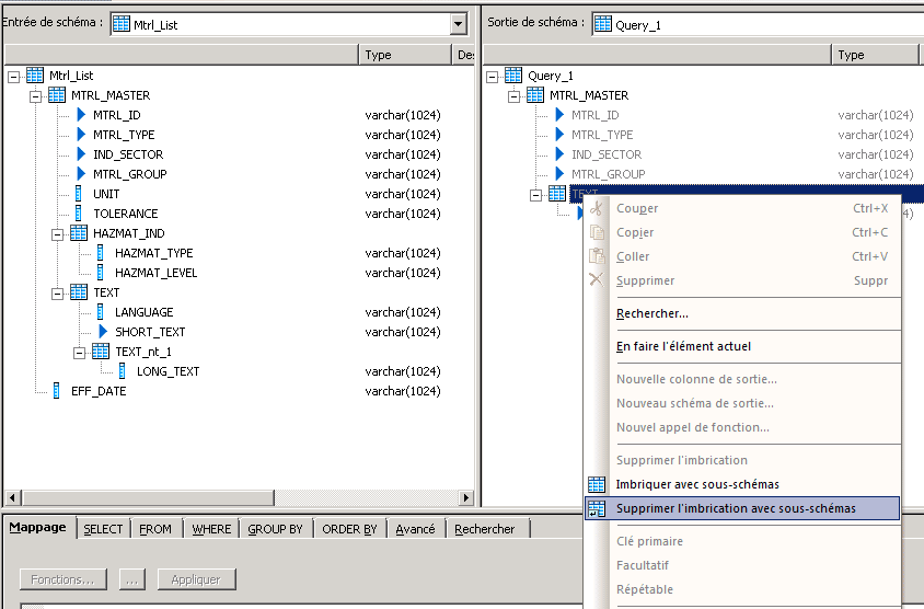 - Depuis le «Entrée de schéma » glissez le schéma « MTRL_Master » dans « Sortie de schéma » ou faites un clic droit « Mapper vers la sortie »