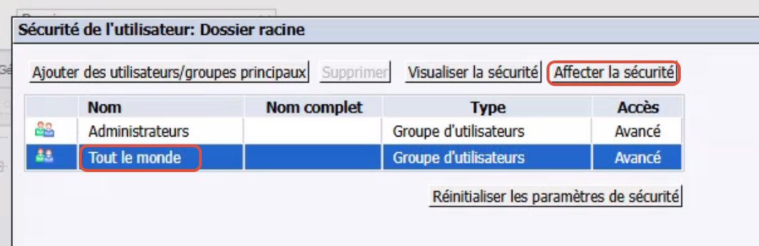 Sélectionnez l’utilisateur ou groupe principal dans la liste de contrôle d’accès, puis cliquez sur Affecter la sécurité.