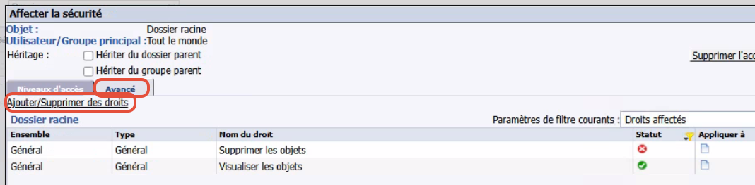Les droits avancés permettent ainsi de personnaliser les autorisations d’un utilisateur ou d’un groupe principal, en complément des niveaux d’accès qui lui sont déjà attribués.